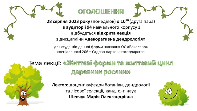 28 серпня 2023 року о 1010 (друга пара) в аудиторії 94 навчального корпусу 1 відбудеться відкрита лекція з дисципліни «Декоративна дендрологія» для студентів денної форми навчання ОС «Бакалавр» спеціальності 206 «Садово-паркове господарство».