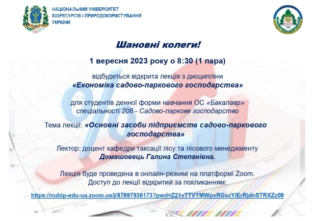 1 вересня 2023 року о 8:30 (1 пара) відбудеться відкрита лекція з дисципліни «Економіка садово-паркового господарства» для студентів денної форми навчання ОС «Бакалавр» спеціальності 206 - Садово-паркове господарство.