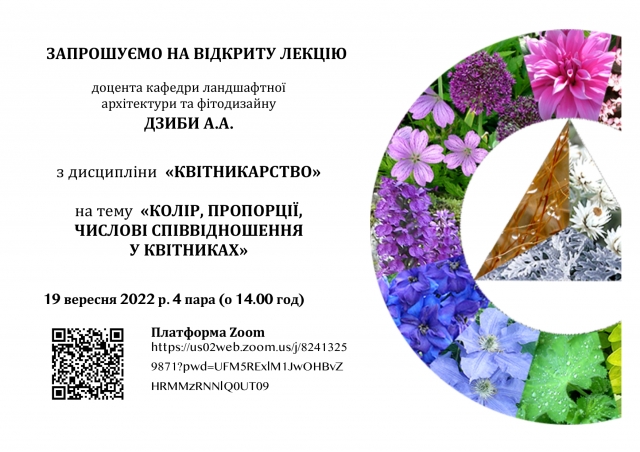 19 вересня 2022 року відбудеться відкрита лекція з дисципліни «Квітникарство» для студентів денної форми скороченого терміну навчання ОС «Бакалавр» спеціальності 206 «Садово-паркове господарство». Початок 14.00 (4 пара). Тема лекції: «КОЛІР, ПРОПОРЦІЇ ЧИСЛОВІ СПІВВІДНОШЕННЯ У КВІТНИКАХ».