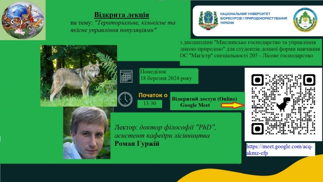 Відкрита лекція з дисципліни "Мисливське господарство та управління дикою природою" 14 березня 2024 року 02:00 - 02:00