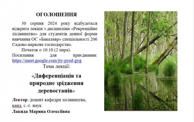 Відкрита лекція з дисципліни "Рекреаційне лісівництво" Покликання: https://meet.google.com/jty-pysd-gyg 30 серпня 2024 року 03:00 - 03:00