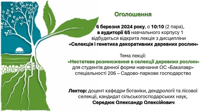 Відкрита лекція з дисципліни "Селекція і генетика декоративних деревних рослин" 29 лютого 2024 року 02:00 - 02:00