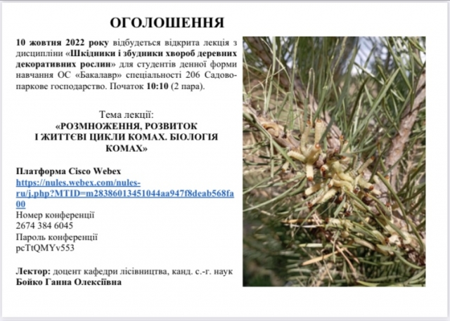 10 жовтня 2022 року відбудеться відкрита лекція з дисципліни «Шкідники і збудники хвороб деревних декоративних рослин» для студентів денної форми навчання ОС «Бакалавр» спеціальності 206 «Садово-паркове господарство». Початок 10:10 (2 пара).