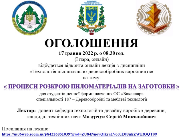 17 травня 2022 р. о 08.30 год. (І пара, онлайн) відбудеться відкрита онлайн-лекція з дисципліни «Технологія лісопиляльно-деревообробних виробництв» на тему: «ПРОЦЕСИ РОЗКРОЮ ПИЛОМАТЕРІАЛІВ НА ЗАГОТОВКИ» для студентів денної форми навчання ОС «Бакалавр» спеціальності 187 – Деревообробні та меблеві технології
