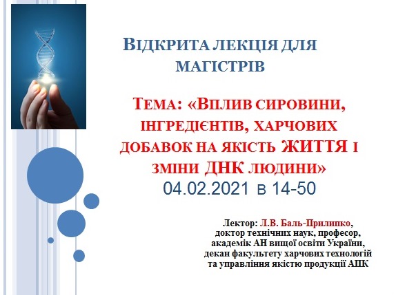 Відкрита онлайн лекція для магістрів на тему: "Вплив сировини, інгредієнтів, харчових добавок на якість ЖИТТЯ і зміни ДНК людини"