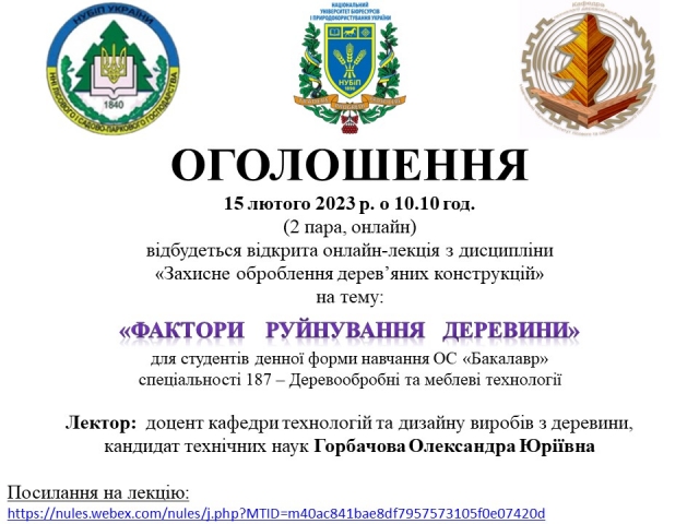 15 лютого 2023 р. о 10.10 год. (2 пара, онлайн) відбудеться відкрита онлайн-лекція з дисципліни «За хисне оброблення дерев’яних конструкцій» на тему: