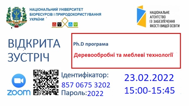 Відкрита зустріч з експертною групою Національного агентства із забезпечення якості вищої освіти під час проведення акредитаційної експертизи освітньо-наукової програми "Деревообробні та меблеві технології" для всіх охочих відбудеться 23 лютого 2022 року о 15:00. Приєднатися до відеоконференції можна за посиланням, що наведено нижче.