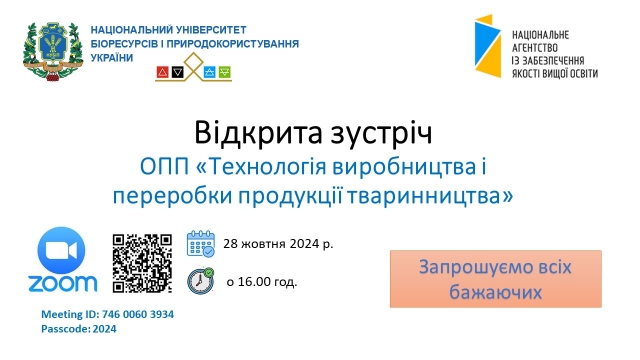 Запрошуємо Вас прийняти участь у Відкритій онлайн-зустрічі, присвяченій акредитації освітньо-професійної програми «Технологія виробництва і переробки продукції тваринництва» (ID 24678) освітнього ступеня «Магістр».
