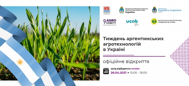 Асоціація «Український клуб аграрного бізнесу» (УКАБ), новітня магістерський проєкт «Агрокебети», Національний інститут аграрних технологій Аргентини (INTA), Посольство Аргентинської Республіки в Україні, Міністерство закордонних справ, міжнародної торгівлі та культури Аргентинської Республіки, за підтримки Міністра аграрної політики та продовольства України запрошують вас 26 квітня 2021 року о 15:00 взяти участь у офіційному відкритті “Тижня аргентинських агротехнологій в Україні” та перегляді першої лекції відкритого відеокурсу, створеного експертами Національного інституту аграрних технологій Аргентини.
