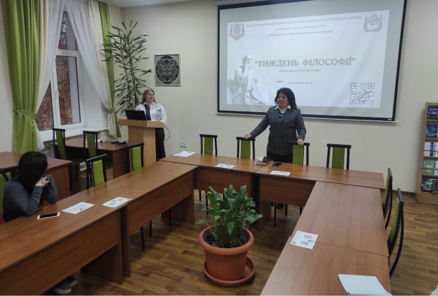 Захід розпочався з вітальних слів декана гуманітарно-педагогічного факультету Інни Савицької та завідувачки кафедри філософії та міжнародної комунікації Валентини Культенко. Інна Савицька наголосили на важливості філософії як основи для розуміння себе та світу, а також на ролі, яку вона відіграє у формуванні критичного мислення й духовного розвитку людини. Крім того, було підкреслено значення навичок ефективного спілкування, які сьогодні є необхідними не лише для професійного успіху, але й для особистісного зростання. Уміння чітко висловлювати свої думки, переконливо аргументувати позицію і взаємодіяти з аудиторією є ключовими аспектами кар’єрного та індивідуального розвитку.