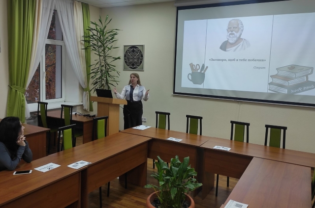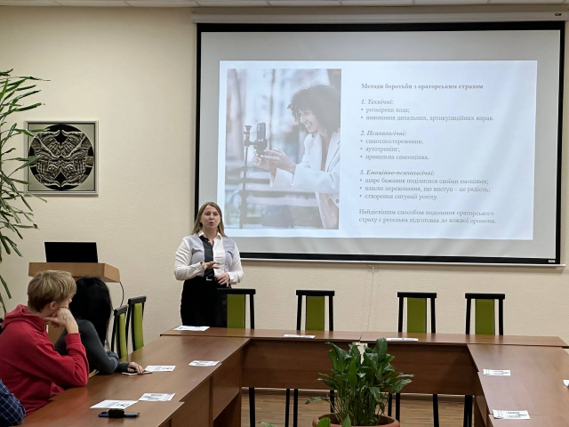 Протягом науково-практичного семінару «Мистецтво бути оратором» асистент кафедри філософії та міжнародної комунікації Вікторія Шеховцова-Бурянова детально ознайомила учасників із ключовими аспектами успішного публічного виступу.
