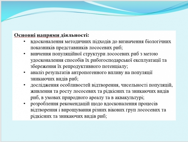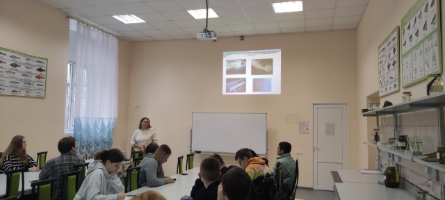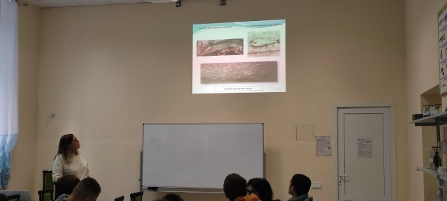 У процесі лекції Анна розповіла про основні напрями діяльності лабораторії та актуальність таких робіт. На сьогодні в результаті господарської діяльності видове різноманіття та кількісні характеристики (чисельність і біомаса) іхтіофауни зазнали суттєвих змін. Вплив зовнішніх чинників призвів до зміни видів-домінантів, зменшення їх чисельності, погіршення популяційних та індивідуальних показників риб. У даних умовах антропогенного навантаження (вирубка лісів, вибір гравію з річок, будівництво гідроелектростанцій), яке безпосередньо впливає на шляхи міграцій та умови розмноження водних живих ресурсів, іхтіофауна є найбільш вразливою ланкою, що призводить до знищення цінних видів риб. У зв’язку з цим виникла нагальна потреба вивчення сучасних популяцій цінних видів риб та розробка пропозицій їх збереження в умовах антропогенного навантаження.