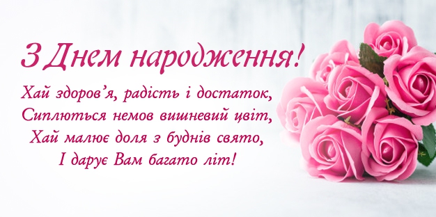 В цей радісний і світлий день Вашого народження хочемо побажати щасливого сьогодні і радісного завтра, красивих мрій і їх здійснення! Бажаємо Вам завжди залишатися життєрадісною людиною. Хай кожен день життя повниться приємними відчуттями, гарним настроєм, задушевними зустрічами і плідною працею! Щастя і радощів у домівку, здоров’я і благополуччя родині, натхнення і творчості для душі! Хай сонце заглядає у вікна, а щастя - в серце! Колектив кафедри