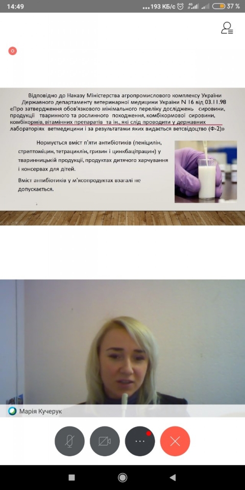 Кучерук Марія - в.о. завідувача кафедри ветеринарної гігієни ім. проф. А.К. Скороходька надала інформацію про можливість вирощування органічних тварин без використання профілактичних антибіотиків. А також про загрози антибіотикорезистентності мікроорганізмів та перевищення максимально допустимих рівнів залишкових кількостей антибіотичних речовин у продукції.
