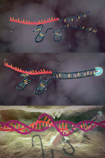 Ферменту Cas9 потрібні дві молекули РНК, щоб знайти свою мішень: так звана CRISPR-РНК з послідовністю розпізнавання для певної послідовності ДНК (червона) та tracrRNA. Центр: Дві молекули РНК можна об’єднати - це полегшує використання CRISPR-Cas9 для дослідницьких цілей. Внизу: CRISPR-РНК разом зі своєю послідовністю розпізнавання приєднується до відповідної послідовності ДНК, визначаючи інтерфейс для Cas9. Так можна вирізати гени або вставити нові.