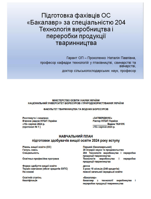 На факультеті тваринництва та водних біоресурсів, який має понад сторічну історію, напрацьовано багаторічний досвід підготовки фахівців – технологів з виробництва і переробки продукції тваринництва. Освітньо-професійна програма «Технологія виробництва і переробки продукції тваринництва» вперше була розроблена у 2018 році відповідно до вимог стандарту вищої освіти за спеціальністю «Технологія виробництва і переробки продукції тваринництва». У 2024 році програма була акредитована Національним агентством із забезпечення якості вищої освіти, при цьому експертною групою було відзначено потужний науковий потенціал професорсько-викладацького складу кафедр університету й факультету, а також матеріально-технічної бази кафедр, навчальних, навчально-наукових та навчально-науково-виробничих лабораторій факультету, Голосіївської навчально-дослідної пасіки, ННВЛ водних біоресурсів та аквакультури тощо.