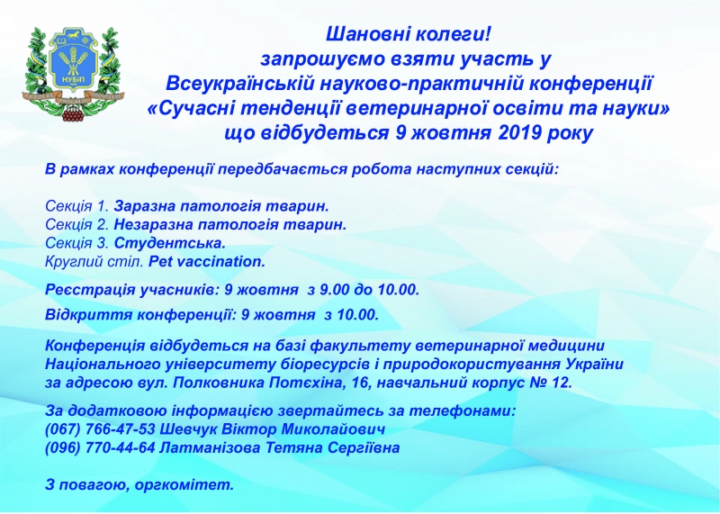 Всеукраїнська науково-практична конференція "Сучасні тенденції ветеринарної освіти та науки" 4 жовтня 2019 року 03:00 - 03:00