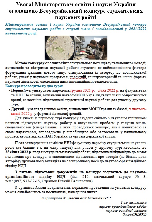 Міністерством освіти і науки України оголошено Всеукраїнський конкурс студентських наукових робіт з галузей знань і спеціальностей у 2021/2022 навчальному році.