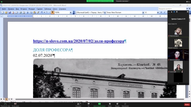 07 листопада 2022 року на четвертій парі відбулася зустріч зі студентами 4 курсу 9 групи, а також на зустрічі були присутніми і студенти інших груп. Всього було присутніх 78 студентів. Зустріч проходила як виховна година в online режимі. Проводила зустріч доцент кафедри епізоотології, мікробіології і вірусології Н. Г. Сорокіна.