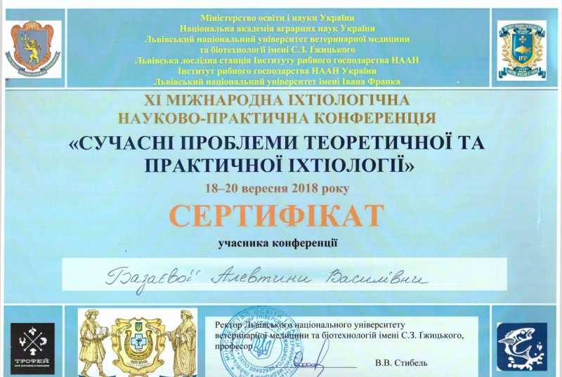 Так, з 18 по 20 вересня доцент кафедри аквакультури Національного університету біоресурсів і природокористування України Алевтина Базаєва, стала учасником ХI Міжнародної іхтіологічної науково-практичної конференції «Cучасні проблеми теоретичної та практичної іхтіології», що проходила на базі Львівського національного університету ветеринарної медицини та біотехнології імені С. З. Гжицького (м. Львів).