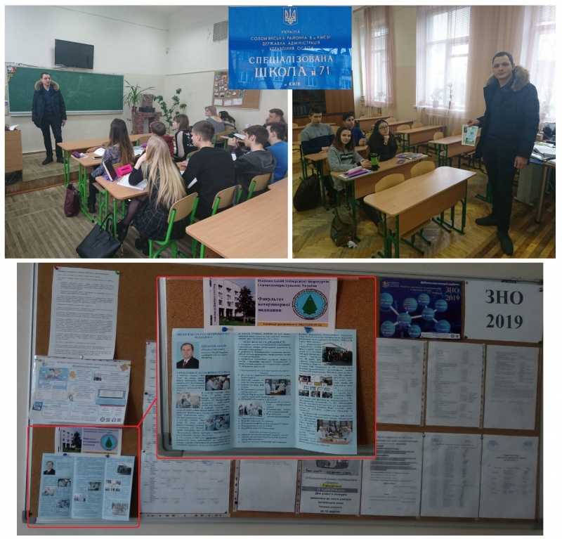 Викладачі кафедри хірургії і патофізіології ім. акад. І.О. Поваженка ФВМ НУБіП України асистент Вадим Климчук та доцент Віктор Дорощук 31 січня 2019 р. провели профорієнтаційну роботу серед учнів 11-х класів у спеціалізованій школі №71 м. Києва щодо вступу у 2019 році на навчання до НУБіП України і, зокрема, на спеціальності 211 -«Ветеринарна медицина» та 212 -«Ветеринарна експертиза, санітарія та гігєна».