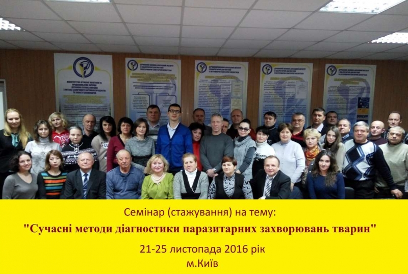 Відповідно до плану роботи Державної служби України з питань безпечності харчових продуктів та захисту споживачів, з 21 по 25 листопада 2016 року науковці-паразитологи України, викладачі та аспіранти кафедри паразитології і тропічної ветеринарії НУБіП України на чолі з завідувачем кафедри, професором Н. М. Сорокою, зокрема, професор М. П. Прус, доценти О. В. Семенко і М. В. Галат, к. вет н. Р. О. Слободян і к. вет. н. І. Ю. Пашкевич, аспіранти В. Є. Зворигіна і А. В. Односум взяли участь у якості спікерів у стажуванні завідувачів паразитологічних та іхтіопатологічних відділів регіональних державних лабораторій та їх філіалів на тему: «СУЧАСНІ МЕТОДИ ДІАГНОСТИКИ ПАРАЗИТАРНИХ ЗАХВОРЮВАНЬ ТВАРИН» на базі Державного науково-дослідного інституту з лабораторної діагностики та ветеринарно-санітарної експертизи.