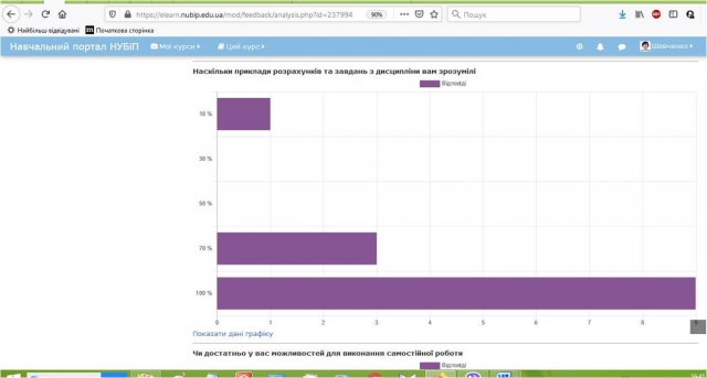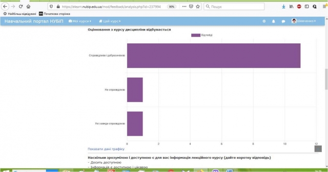 Опитування складалося з 7 запитань різних типів, на які студенти давали коментарі, оцінювали якість електронного навчального курсу, а також рівень викладання даної дисципліни.