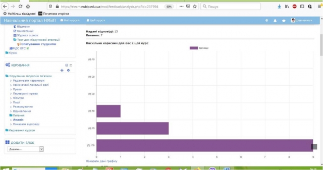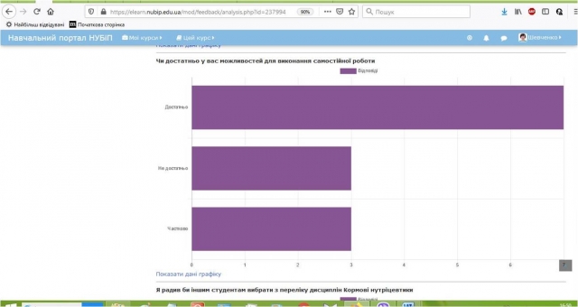 Враховуючи ці вимоги, було розроблено програму опитування студентів 3 курсу спеціальності 212 «Ветеринарна гігієна, санітарія і експертиза» ОС Магістр з дисципліни «Кормові нутріцевтики» з використанням ресурсу «Зворотній зв’язок», яка розміщена за адресою https://elearn.nubip.edu.ua/course/view.php?id=2554.