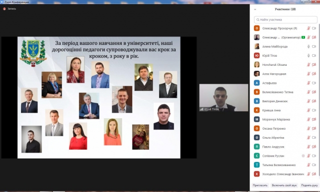 Завідувач випускової кафедри, доктор педагогічних наук, доцент Руслан Васильович Сопівник сердечно привітав випускників із успішним завершенням навчання та отриманням дипломів державного зразка. У цю урочисту мить, яка увінчала старання здобувачів, Руслан Васильович передусім подякував за вибір навчального закладу для здобуття освіти. Побажав не забувати свою «Альма-матер», завжди досягати успіхів, завдяки здобутим у виші знанням зробити гарну кар’єру, примножувати добро і справедливість, бути завжди собою та залишатись людиною, постійно самореалізовуватись, любити ближнього, служити Батьківщині. Наприкінці вітального слова завідувач кафедри запропонував співпрацю та запросив приводити своїх рідних і знайомих до нас на навчання.