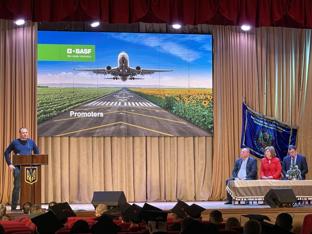 Бувший студент агробіологічного факультету, доцент кафедри рослинництва, а сьогодні представник компанії BASF - Євгеній Качур, привітав із святом і запросив випускників та студентів старших курсів на стажування у компанію.