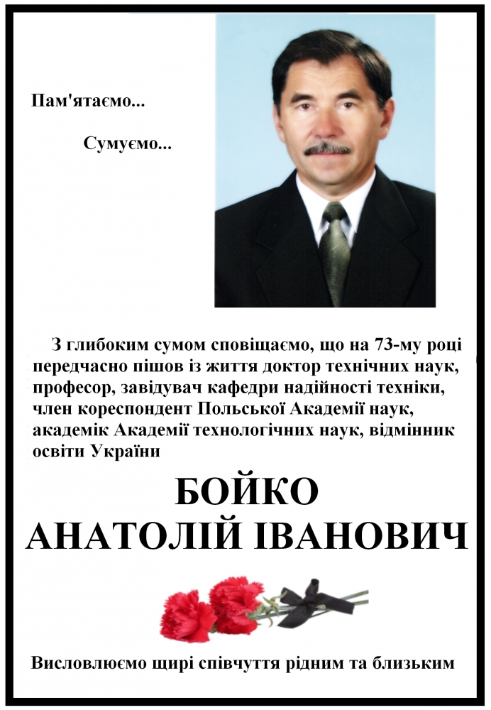 Висловлюємо співчуття з приводу передчасної смерті д.т.н., професора, завідувача кафедри БОЙКА АНАТОЛІЯ ІВАНОВИЧА 22 березня 2019 року 02:00 - 02:00