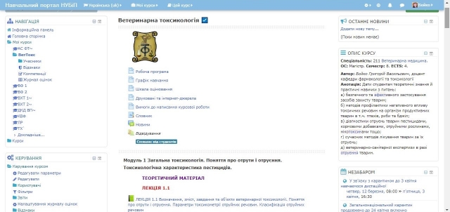Студенти використовують електронний навчальний курс «Ветеринарна токсикологія». Тут розміщена загальна інформація про курс, є лекції, презентації до них, завдання до лабораторної та самостійної роботи, які необхідно опрацьовувати та здавати через портал.