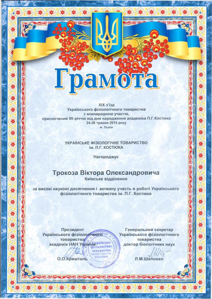 Визнанням значного внеску у фізіологічну науку, який зробили вчені нашого університету було нагородження професора В.О.Трокоза грамотою за високі наукові досягнення й активну участь у роботі товариства, яку вручив академік О.О.Кришталь.