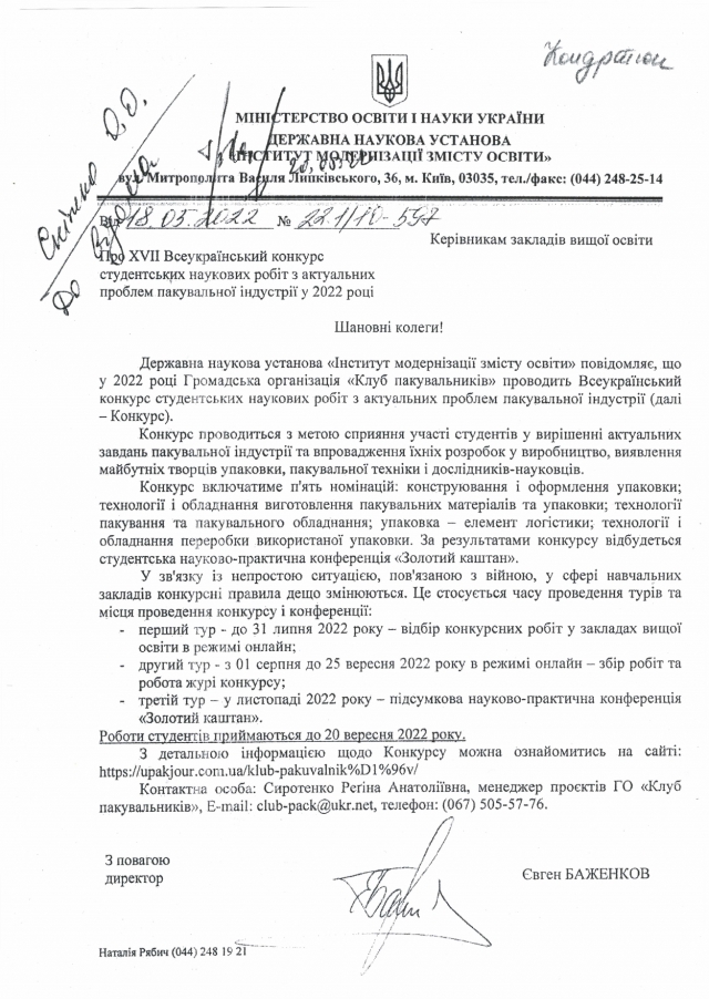 XVII Всеукраїнський конкурс студентських наукових робіт з актуальних проблем пакувальної індустрії у 2022 році 23 травня 2022 року 03:00 - 03:00