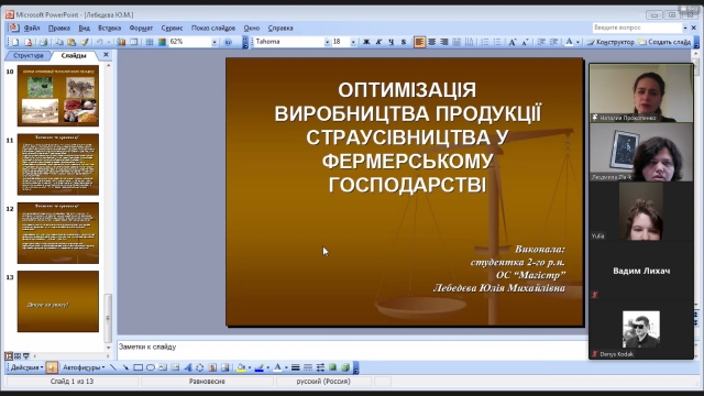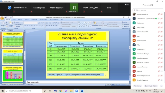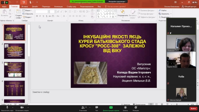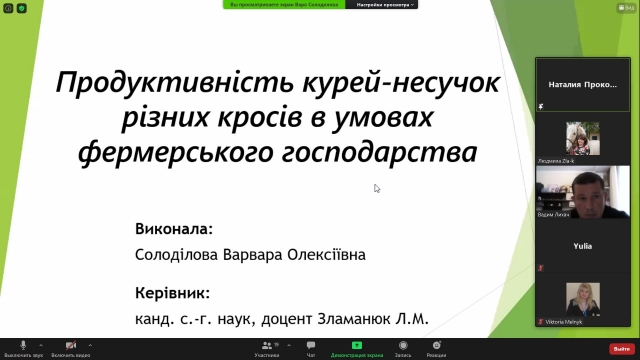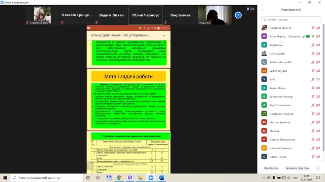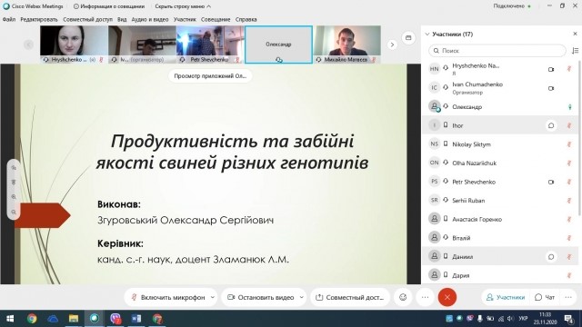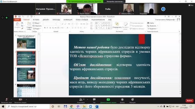 На кафедрі технологій у птахівництві, свинарстві та вівчарстві 27.11.2020 року відбувся попередній захист випускних робіт за магістерськими програмами ‟Технологічний менеджмент у свинарстві” та ‟Сучасні технології промислового птахівництва”. Результати своїх досліджень доповіли 17 магістрів.