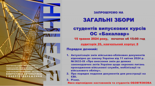 Загальні збори студентів випускових курсів ОС «Бакалавр» Приєднатися 11 травня 2024 року 03:00 - 03:00