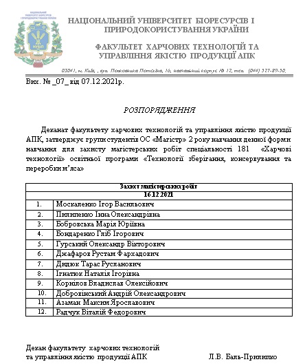 Захист магістерських робіт денної форми навчання спеціальності 181 «Харчові технології» освітньої програми «Технології зберігання, консервування та переробки м’яса» відбудеться 16.12.2021 р. в 12 корпусі 317 д аудиторії о 10 годині.