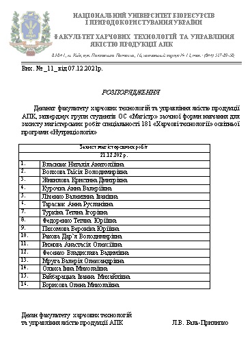Захист магістерських робіт заочної форми навчання спеціальності 181 «Харчові технології» освітньої програми «Нутриціологія» відбудеться 21.12.2021 р. в 12 корпусі 317д аудиторії о 10 годині.