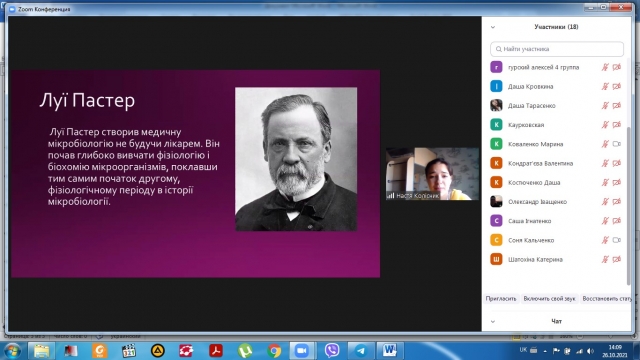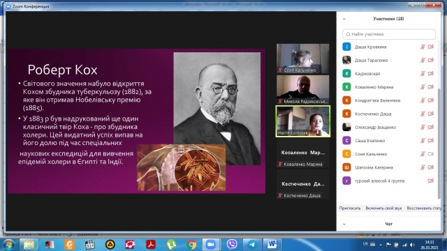 Студентка Колісник А. коротко висвітлює основні наукові досягнення Луі Пастера. Студентка Колісник А. розповідає за видатні досягнення у мікробіології, вченого світового рівня Роберта Коха.
