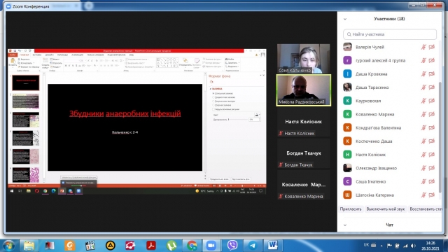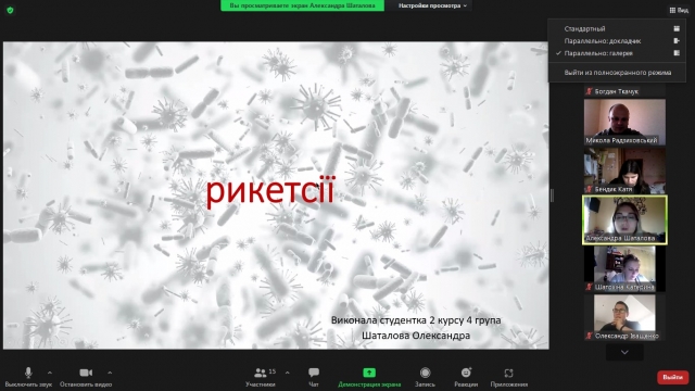 Навіть під час дистанційного навчання студенти факультету ветеринарної медицини проявляють ентузіазм і наполегливість у вивченні фундаментальних дисциплін. І так у період з 26.10.2021 по 15.11.2021 року зі студентами, 2 курсу 4 групи, факультету ветеринарної медицини (спеціальність «Ветеринарна медицина» - 211) було проведено ряд лабораторних занять з ветеринарної мікробіології на платформі Zoom у вигляді наукових семінарів. Студенти виявили зацікавленість щодо проведення занять у вигляді наукового семінару, де самі представляли доповіді у вигляді презентацій на надзвичайно цікаві теми: «Видатні мікробіологи 19 – 20 сторіччя» «Рикетсіози» і «Бактеріальні анаеробні інфекції», «Мікоплазмоз» і «Лептоспіроз». Обговорення заслуханого матеріалу проходило надзвичайно активно студенти ставили питання один одному, що створило прекрасну атмосферу і викликало цікавість повторити подібний навчальний експеримент.