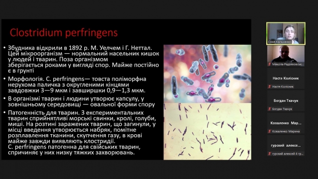 Студентка Кальченко С. висвітлює інформацію щодо анаеробних інфекціях і їх роль у тваринництві. Студентка Кальченко С. характеризує морфологічні особливості деяких анаеробів на прикладі Clostridium perfringens. Студентка Шаталов О. Оголошує тему свого докладу «Рикетсії».