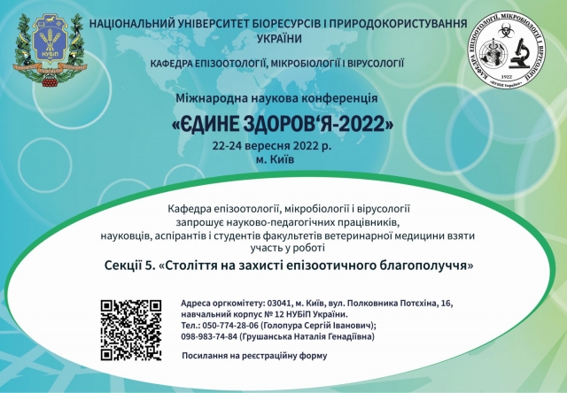 Запрошуємо 22-24 вересня прийняти участь у Міжнародній науковій конференції "Єдине здоров'я - 2022"