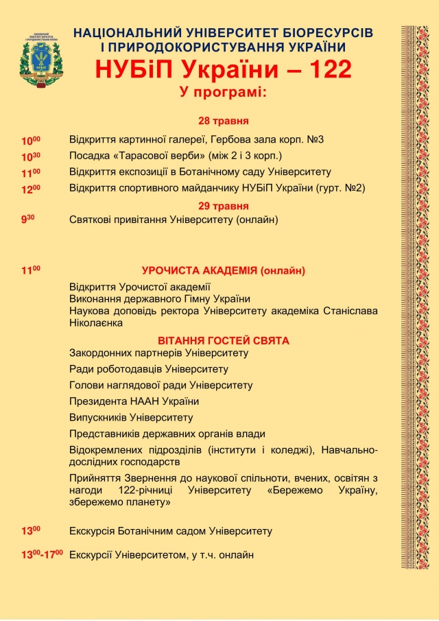 Запрошуємо до святкових урочистостей з нагоди 122-річчя Національного університету біоресурсів і природокористування України