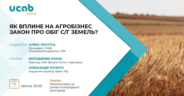 Асоціація “Український клуб аграрного бізнесу” спільно з агенцією UCABevent запрошують Вас 07 квітня 2020 р. о 10:00 на онлайн-семінар на тему: “Як вплине на агробізнес закон про обіг с/г земель?”.