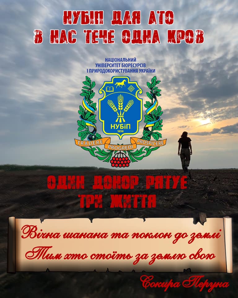 Враховуючи велику потребу лікувально-профілактичних закладів м. Києва у крові, її компонентах і препаратах, для своєчасного надання трансфузійної допомоги постраждалим військовослужбовцям зони АТО/ООС, запрошуємо всіх бажаючих взяти участь у благодійному проекті «НУБіП для АТО. В НАС ТЕЧЕ ОДНА КРОВ».