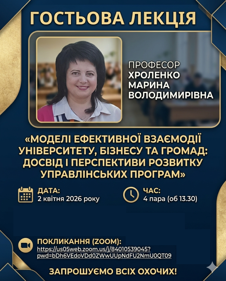 2 квітня 2026 року відбудеться гостьова лекція професора Марини ХРОЛЕНКО на тему «Моделі ефективної взаємодії університету, бізнесу та громад: досвід і перспективи розвитку управлінських програм» для студентів спеціальності «Менеджмент» гуманітарно-педагогічного факультету.