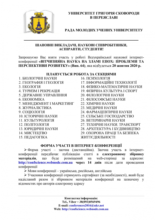 Запрошуємо на інтернет-конференцію «ВІТЧИЗНЯНА НАУКА НА ЗЛАМІ ЕПОХ: ПРОБЛЕМИ ТА ПЕРСПЕКТИВИ РОЗВИТКУ» 5 жовтня 2020 року 03:00 - 03:00