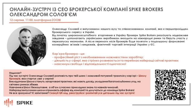 12 серпня 2022 року об 11.00 запрошуємо на онлайн-зустріч із СЕО брокерської компанії SPIKE BROKERS, випускником факультету аграрного менеджменту Олександром Солов'єм
