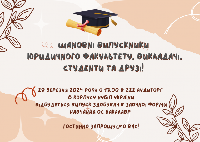 Запрошуємо на урочисту церемонію вручення дипломів бакалаврів спеціальності 081 «Право» заочної форми навчання! Адміністрація юридичного факультету 25 березня 2024 року 02:00 - 02:00
