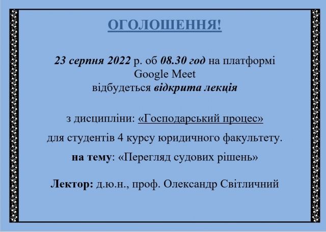 Запрошуємо на відкриту лекцію професора кафедри цивільного та господарського права Світличного Олександра Петровича! Посилання на відкриту лекцію: https://meet.google.com/bvb-pziz-wjh 15 серпня 2022 року 03:00 - 03:00